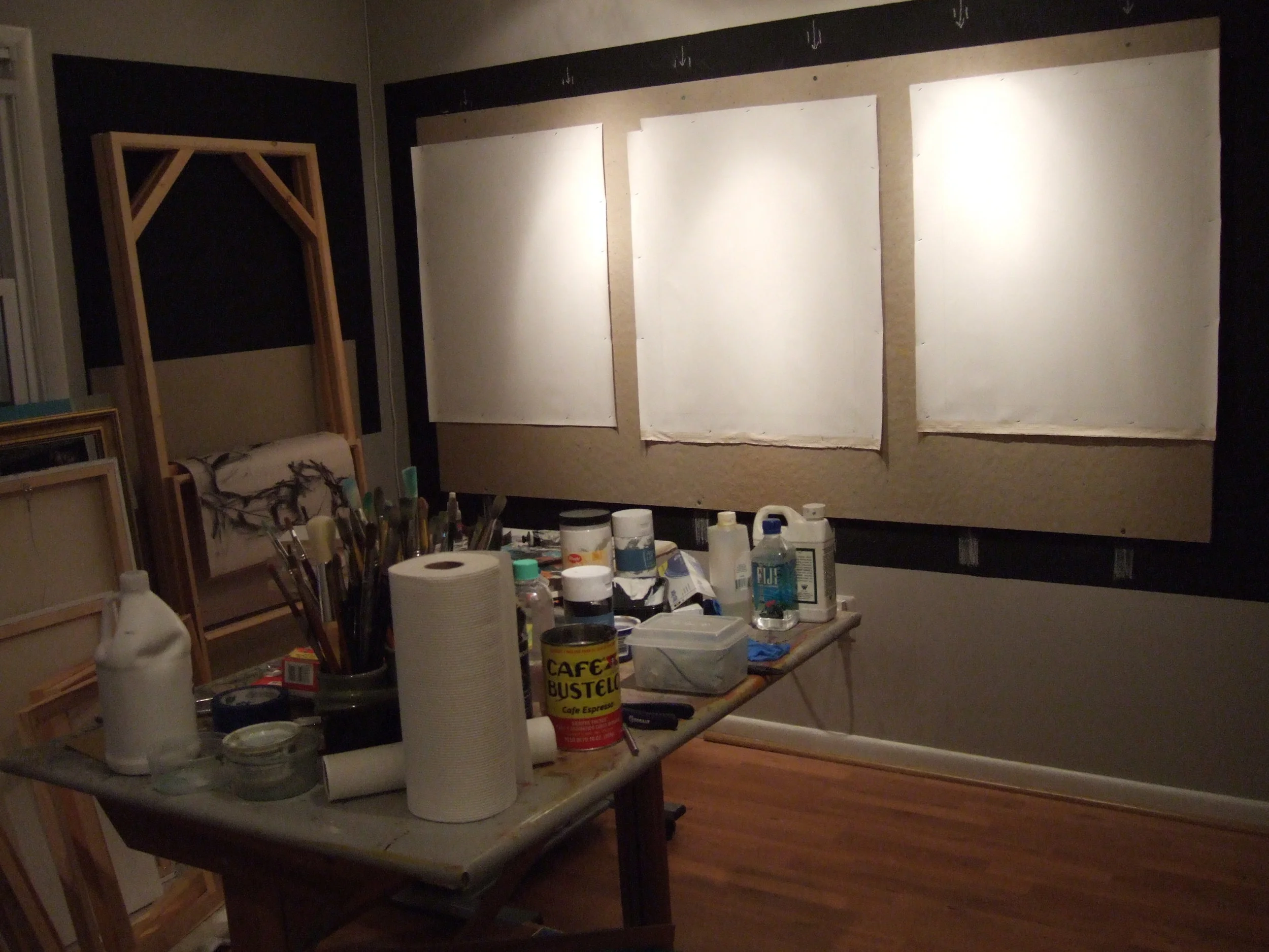 I was going to stretch these canvases on the frames first. I did one, and then I decided it's too pretty and "finished" feeling (even though it's blank). The finished-ness of it adds a sense of pressure to make something finished. Commitment. An unstretched canvas stapled to the wall, on the other hand, allows me room to make a hideous mess, and if it's a bad hideous mess (as opposed to a good one), I can rip it down and start over. Mind games.